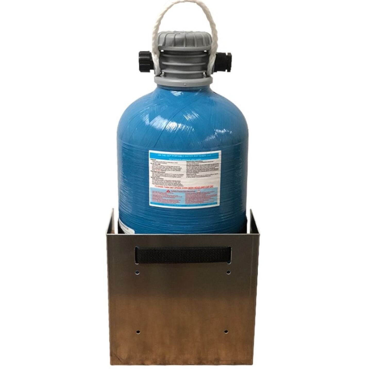 This aluminum bracket fits all our 9" X 18" softener and deionizer tanks. It comes with mounting screws and nylon strap to secure the unit in the bracket.