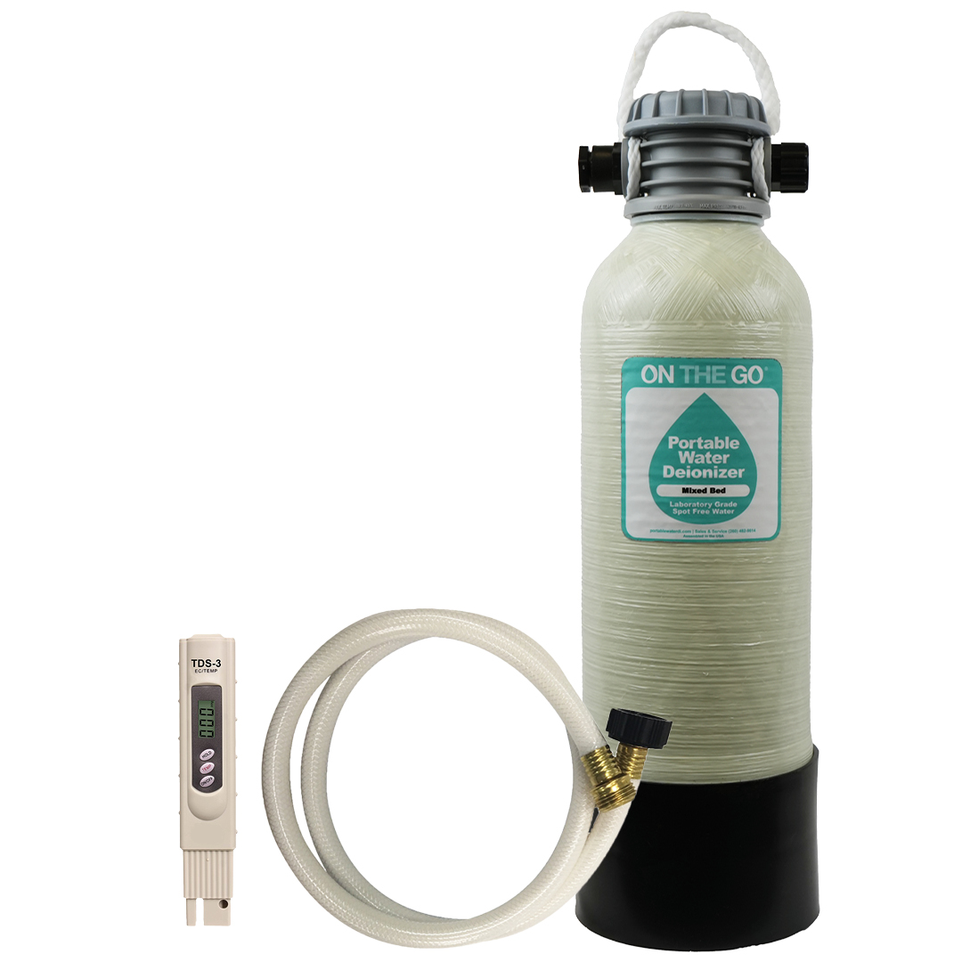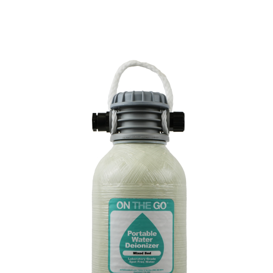 This compact deionizer is filled with mixed bed resin and works great in the garage, laboratory, on the road, or anywhere you need deionized (DI) or spot free water.