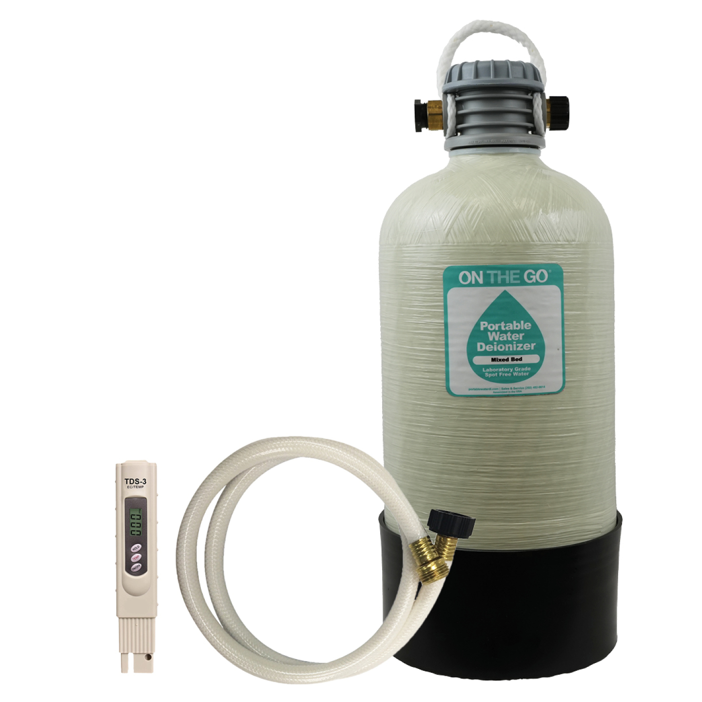 This deionizer measures 9.25" in diameter by 22" in height. The unit contains 1/2 cubic feet of high grade virgin mixed bed resin, and is easy to hook up or remove depending on your application. The unit comes complete with the deionizer, 4' high pressure hose, a hand-held TDS meter, and a cap/plug for the inlet/outlet.