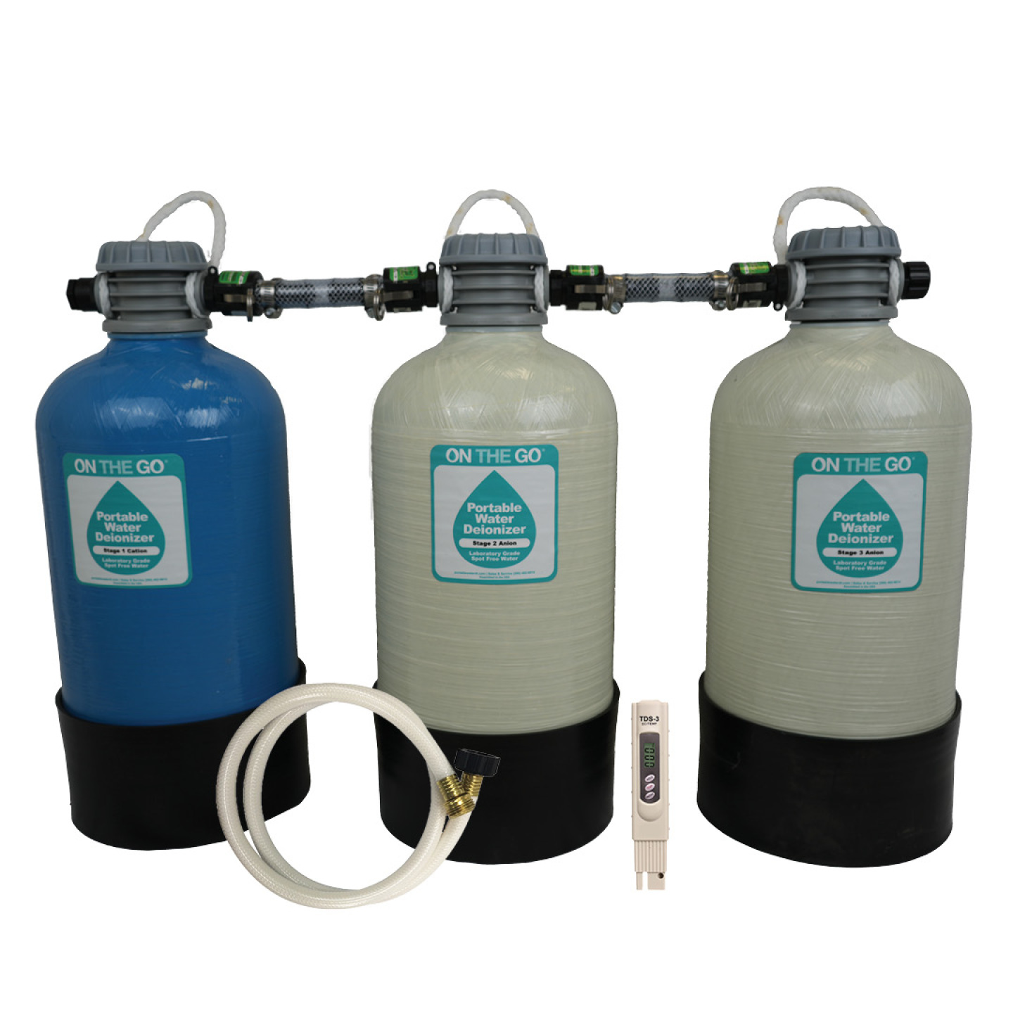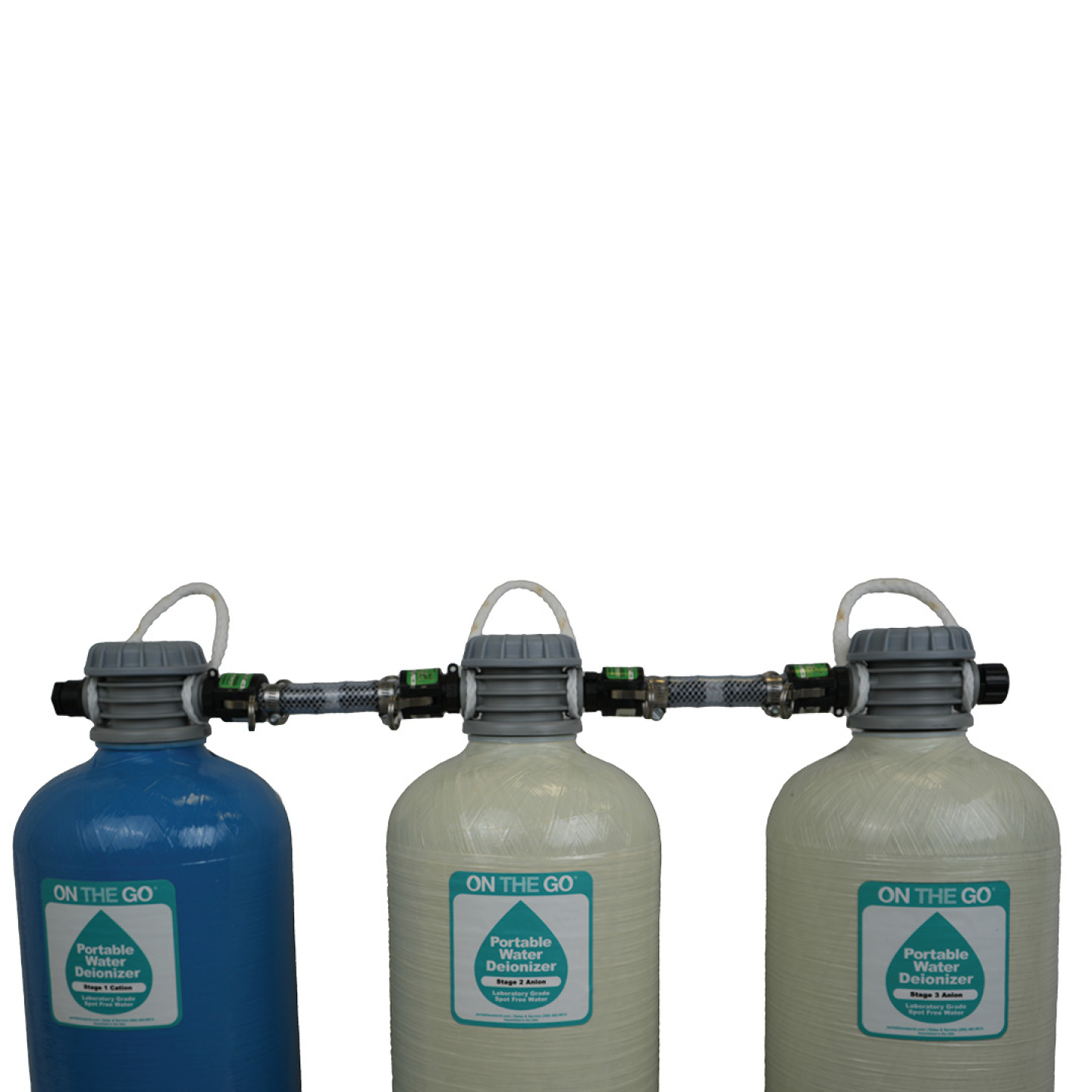 This system will produce DI water at the lowest cost per gallon, provides an additional benefit related to return on investment, and ongoing operating cost. Made up of one .50 cubic foot tank of virgin cation resin, and two .50 cubic foot tanks of virgin anion resin, this deionizer will produce approximately 50% more water than the dual tank deionizer. Stage 1 is the cation tank and stages 2 and 3 are anion tanks. This system needs an area of 40" wide by 22" high by 10" deep for hook-up. At 96 pounds, moving the unit is no problem. This unit comes complete with the deionizer, 4' high pressure hose, a hand-held TDS meter, and a cap/plug for the inlet/outlet.